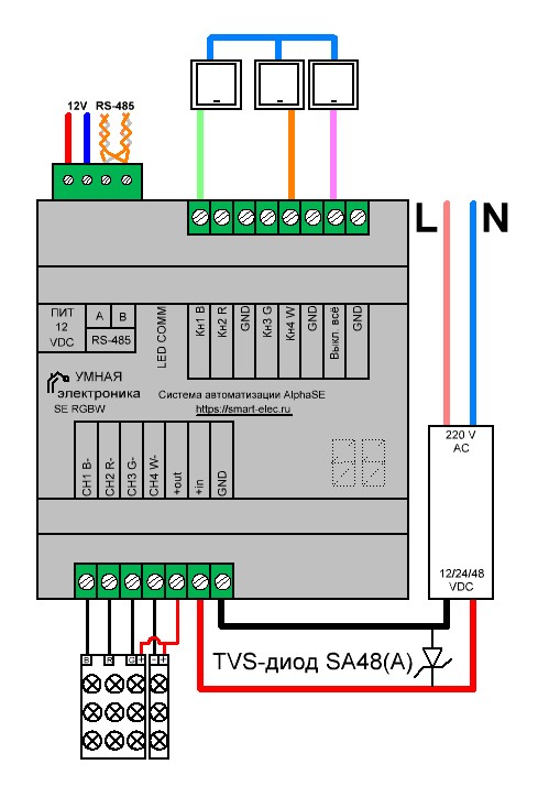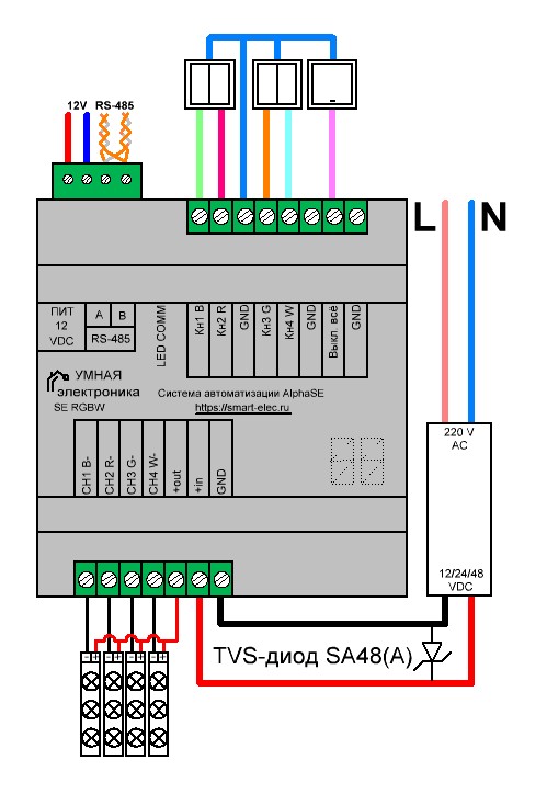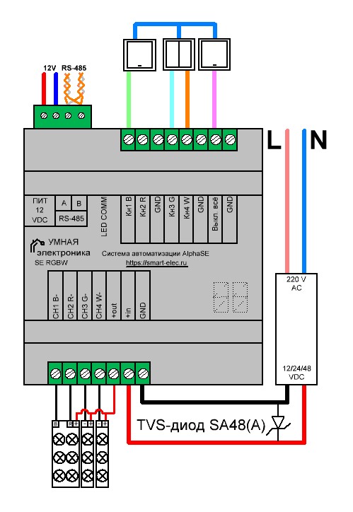 SE RGBW поддерживает управление 4 каналами. Возможны следующие конфигурации подключения: